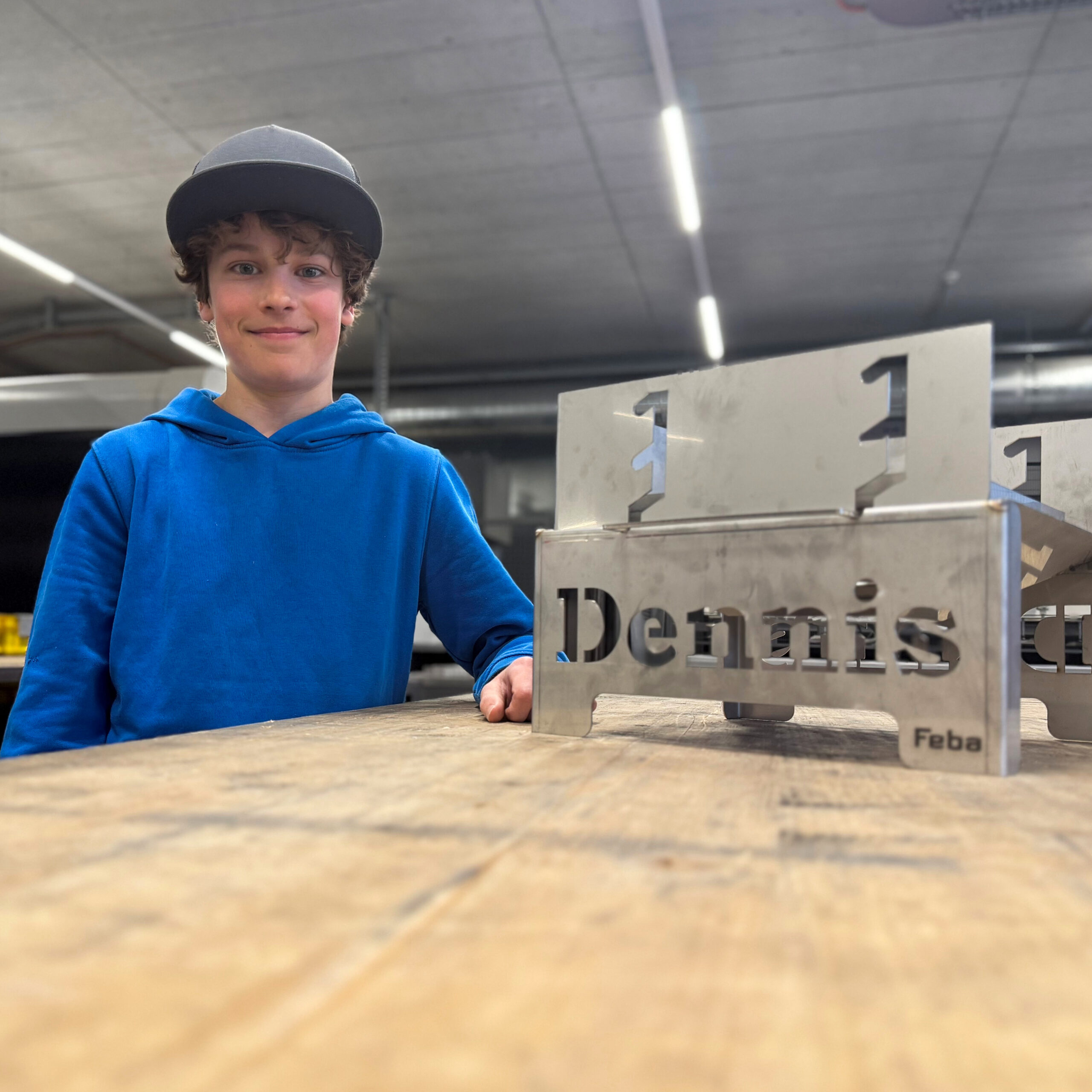 Ein Highlight seines Tages: Dennis hat seinen eigenen, massiven Grill hergestellt – inklusive eingelasertem Namen! Ein echtes Unikat!