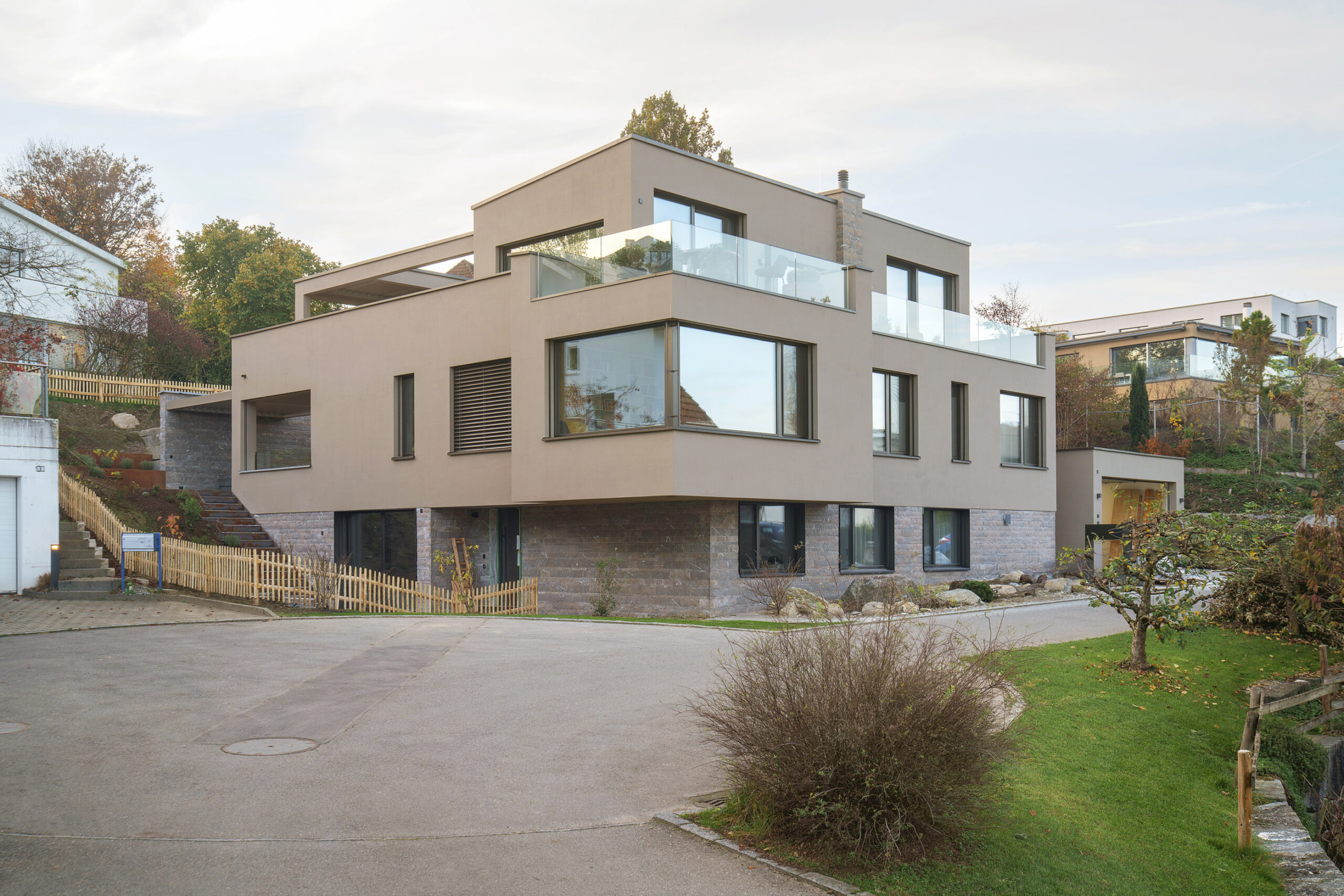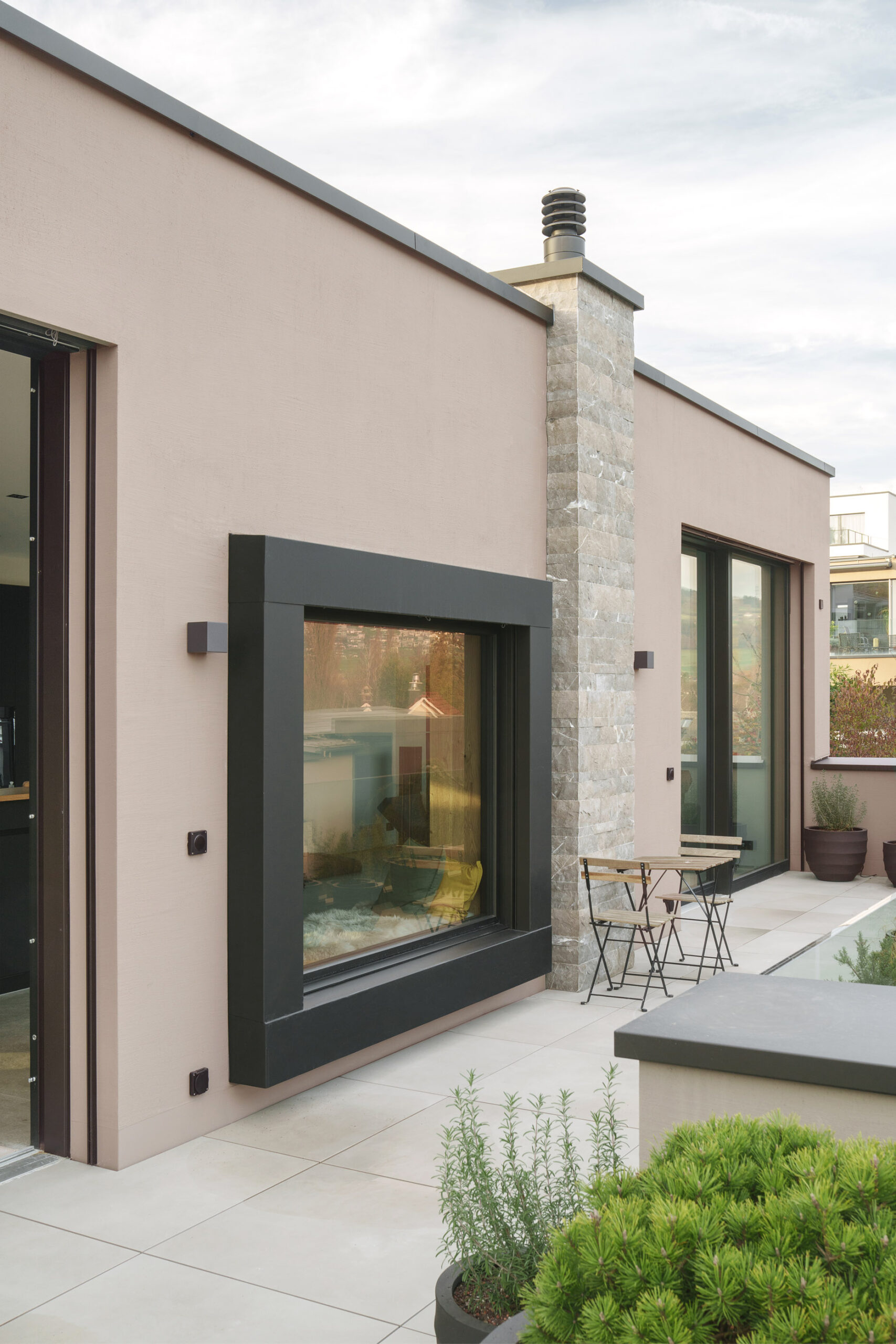 Im Seeblickquartier in Sursee entstand ein Einfamilienhaus mit Einliegerwohnung an ruhiger Lage am Zonenrand. Das Grundstück bietet eine eindrückliche Aussicht auf den Sempachersee und die Alpen. Der Baukörper ist in mehrere Teilvolumen gegliedert: Über dem zweigeschossigen Sockelbau liegt ein Attikageschoss mit gedecktem Aussenbereich, die Doppelgarage ist vom Hauptvolumen abgesetzt. Ein grossformatiges Panoramafenster prägt den Wohnraum und öffnet ihn grosszügig zur Landschaft. Die tief eingeschnittene Nische lädt zum Verweilen ein und stärkt die Verbindung zwischen Innen- und Aussenraum. Die aussergewöhnlich breite Zarge verleiht der Öffnung räumliche Tiefe und betont die skulpturale Wirkung der Wand. Die Feba durfte dieses markante Bauteil produzieren und mit höchster Präzision montieren.